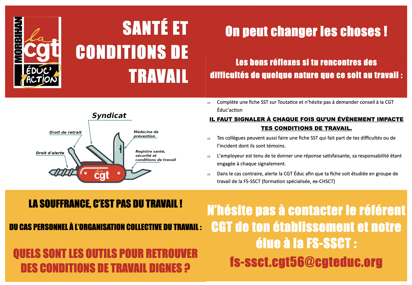 La CGT Éduc’action 56 consacre donc une part importante de son action syndicale à défendre notre santé et nos conditions de travail. Il faut mettre en lumière une violence institutionnelle plutôt que de renvoyer chacun à sa responsabilité individuelle ou de psychologiser des souffrances.